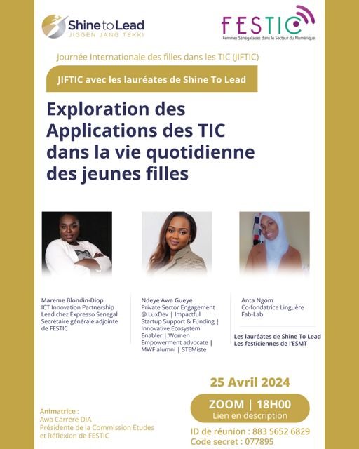 À l’occasion de la Journée Internationale des Filles dans les TIC qui aura lieu le 25 avril 2024, nous vous invitons à participer au talk de Shine To Lead et Association Femmes et TIC au Sénégal ( FESTIC).